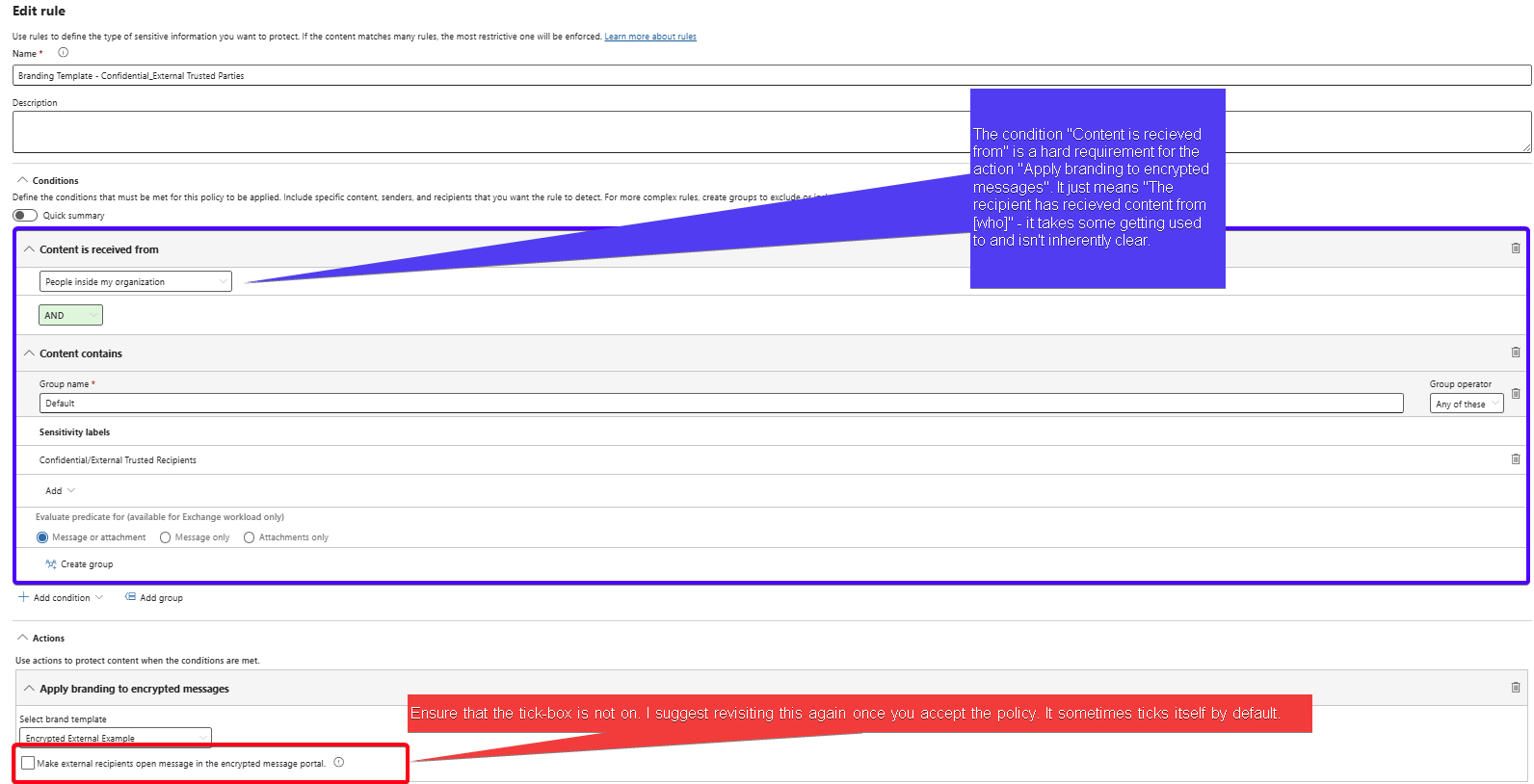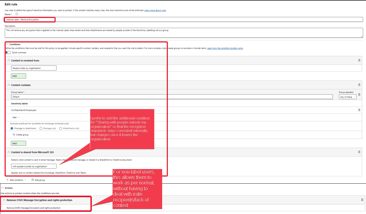 The security aspect that is often skipped, as I’ve laid out previously is encryption - which is powered by Purview Message Encryption (previously known as Office Message Encryption) and Azure Rights Management. The difficulties faced by many organisations or MSPs who attempt to roll them out is;