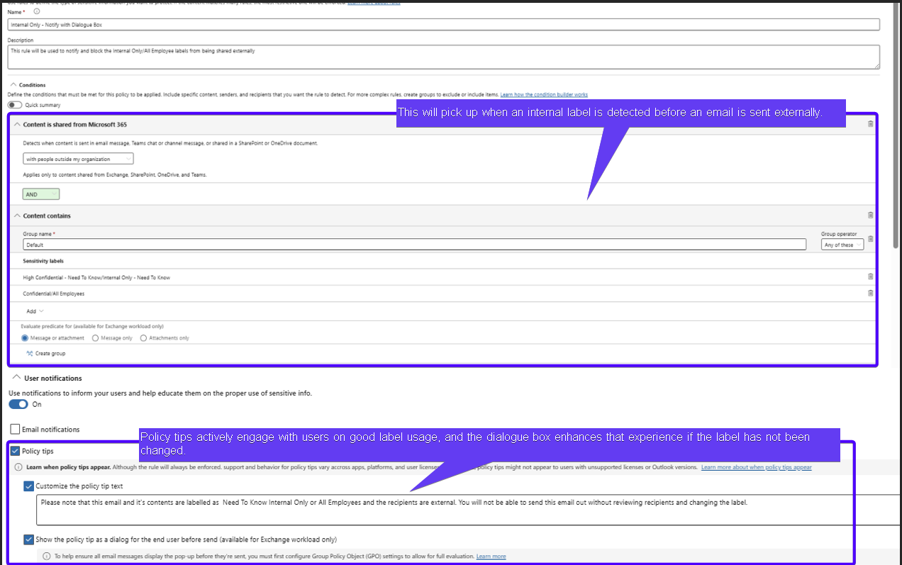 Users will have both a Policy Tip instructing them on correct label usage and a Dialogue Box with the same policy tip - visible when they click “Send”.